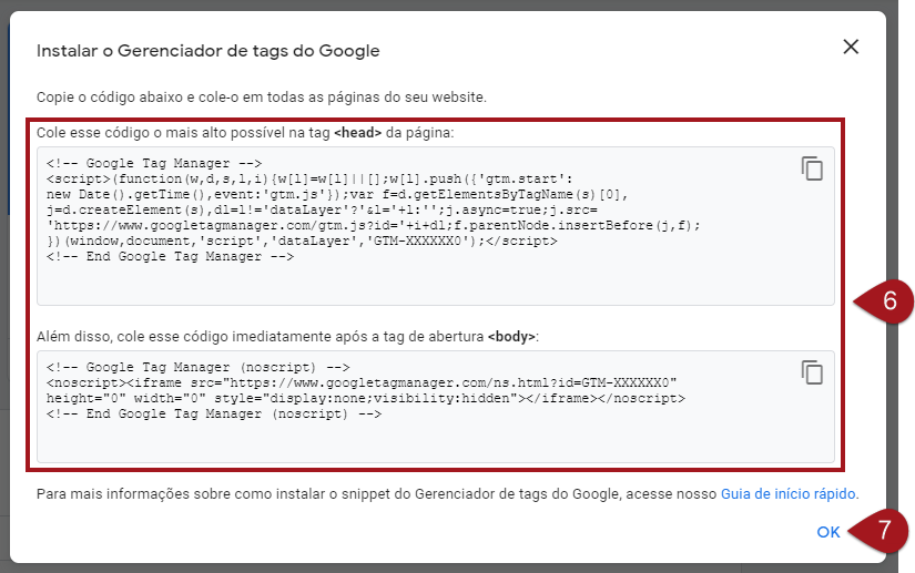 Após criar o contêiner/ Conta, o GTM fornecerá dois trechos de código: