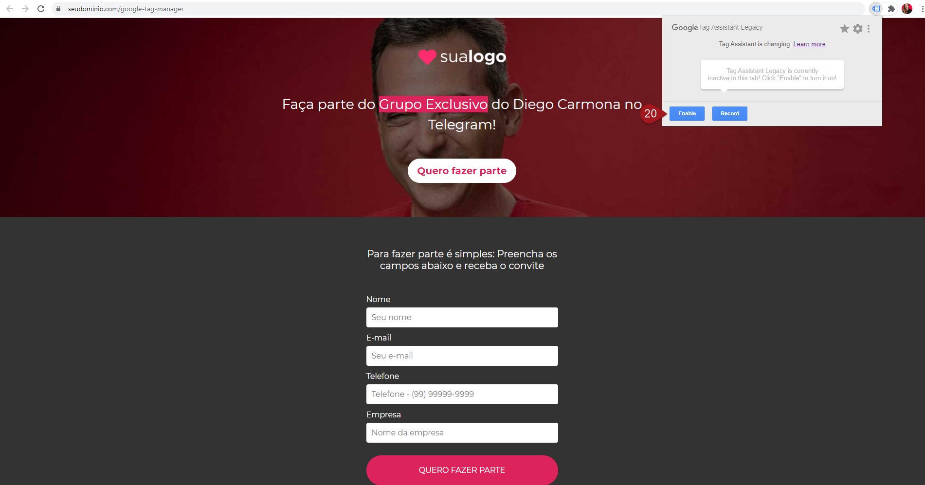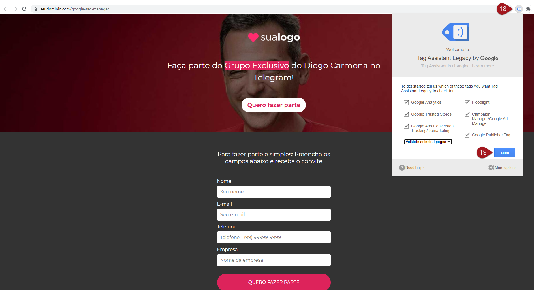 Há duas formas de verificar se as tags foram inseridas corretamente e estão funcionando na página. Uma delas é pela extensão Tag Assistant Legacy (by Google) e outra é por este site que o Google está desenvolvendo. Ensinaremos como verificar a instalação delas das duas maneiras.