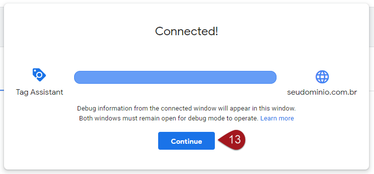 Volte agora para a aba do Tag Assistant e clique em “Continue”.