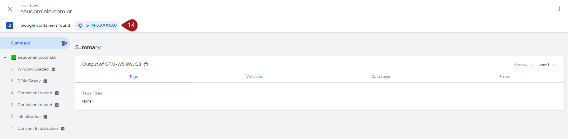 Se estiver tudo certo com os scripts inseridos na página, o código do seu Google Tag Manager aparecerá na parte superior. Caso tenha configurado outras tags e variáveis, as mesmas aparecerão em “Summary” juntamente com outros detalhes técnicos.