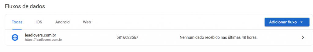 Em fluxo de dados é possível configurar a página que será instalada o código do GA.