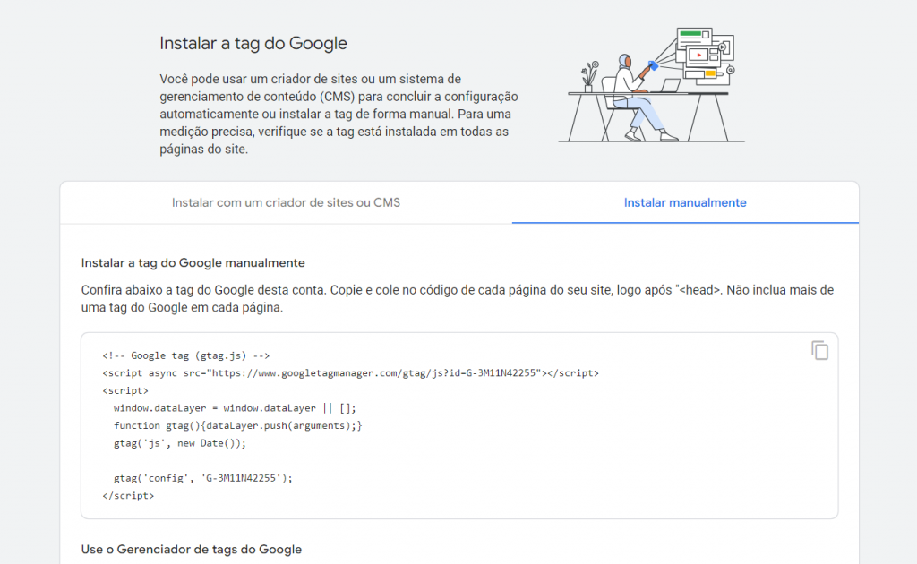Nº 5- Abrirá uma nova janela, clique na aba Instalar manualmente, e copie o código do GA.