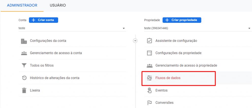 Nº 3 – Agora que já escolheu a propriedade (caso tenha mais de uma) clique em Fluxo de dados.