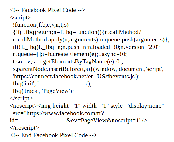 Com este código, é possível utilizar o Pixel e suas funções. Ele informa automaticamente ao Facebook quando sua página é visualizada. Um exemplo de código do Pixel do Facebook: