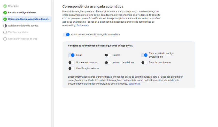 É uma configuração opcional quando você está gerando o código do pixel, você pode ativá-la ou não. Se ativar, poderá selecionar quais dados serão enviados para o Facebook. Além disso, “a correspondência avançada pode ajudar você a otimizar seus anúncios do Facebook para conseguir melhores resultados”¹. Com essa configuração ativada, você pode enviar informações de leads juntamente com seus eventos do pixel. Dessa forma, o robô do Facebook consegue entender melhor seu público e levar seus anúncios às pessoas certas.