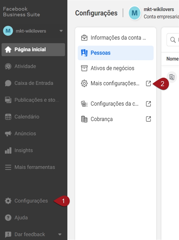 Nº1– Acesse seu perfil Business Manager do Facebook. No menu lateral esquerdo, clique em “Configurações”.