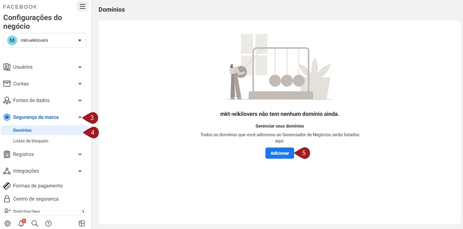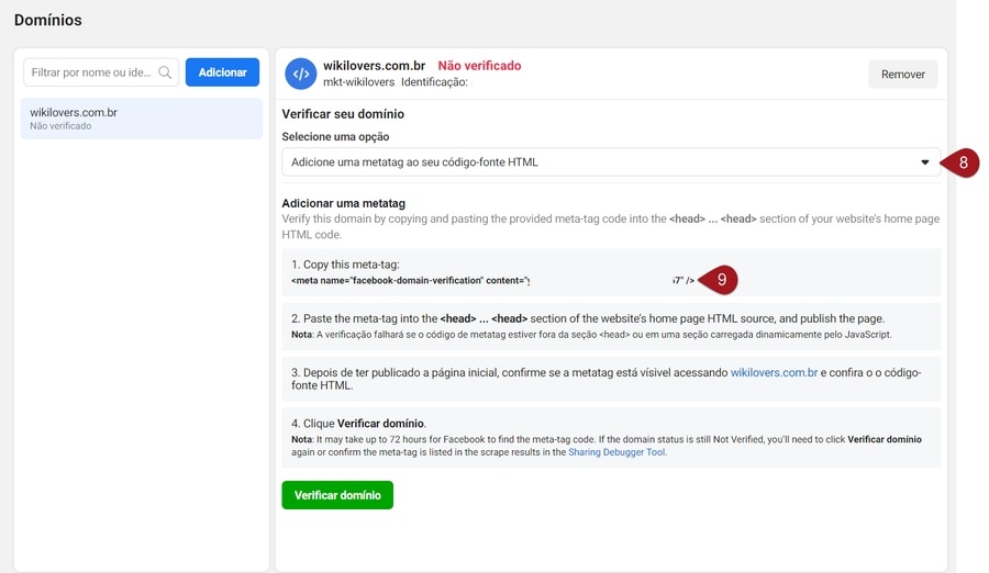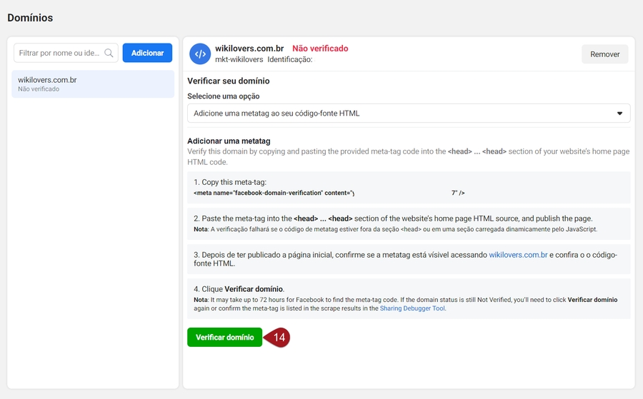 Nº14– Novamente no Business Manager, na tela em que pegamos o código da MetaTag, clique em “Verificar domínio”.