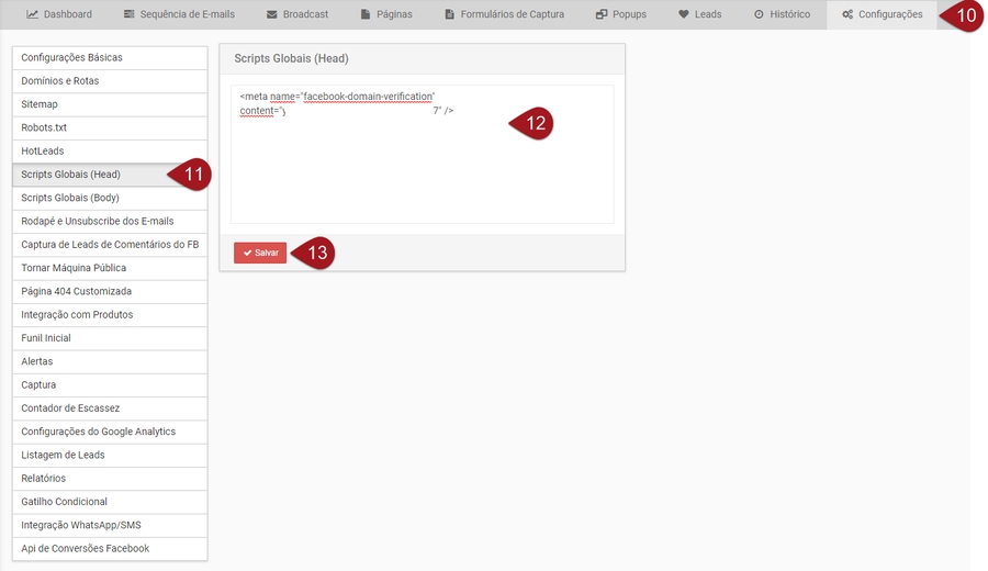 Nº11– Vá até a seção “Scripts Globais (HEAD)”. Feito isso, abrirá um campo de texto para adicionar scripts em todas as páginas da máquina em questão.