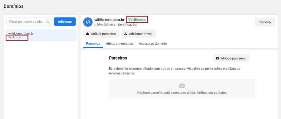 Se toda a configuração for validada, sua tela de domínios do Facebook ficará semelhante à imagem abaixo: