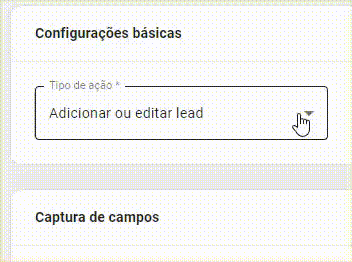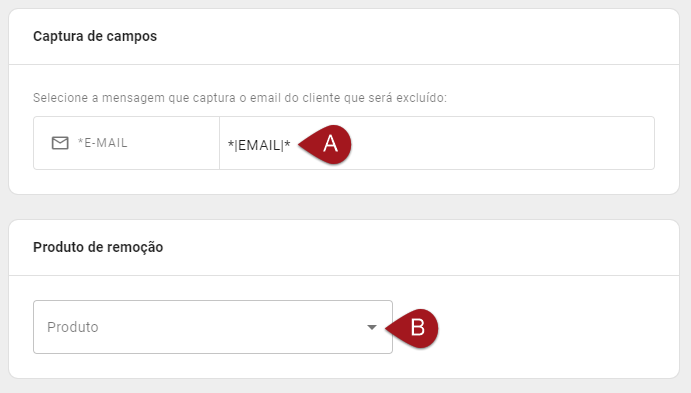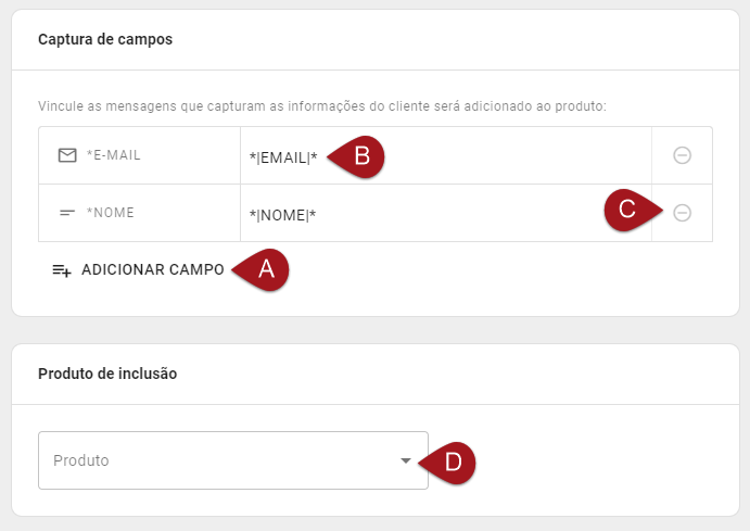 A) Em Captura de Campos, selecione os campos que deseja inserir no lead. Assim como na Ação de adicionar lead, cada campo de captura deve ter sido capturado previamente através de alguma Mensagem. Porém, para inclusão em Produtos existem menos opções dos campos que podem ser capturados sendo esses E-mail, Nome, Telefone e Documento.