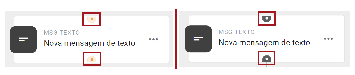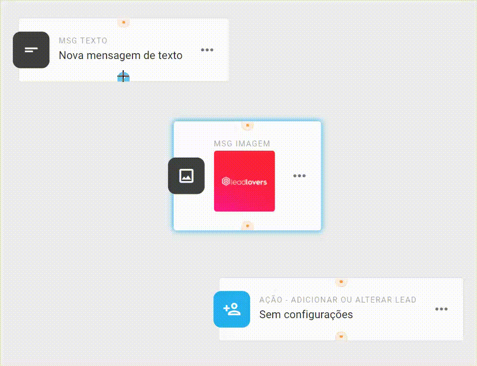 Observe que em cima e em baixo de cada balão possui uma bolinha. Essa bolinha em laranja indica que o bolão não possui nem fluxo antes ou depois do mesmo. Se a bolinha estiver cinza significa que a Mensagem ou a Ação está conectada.
