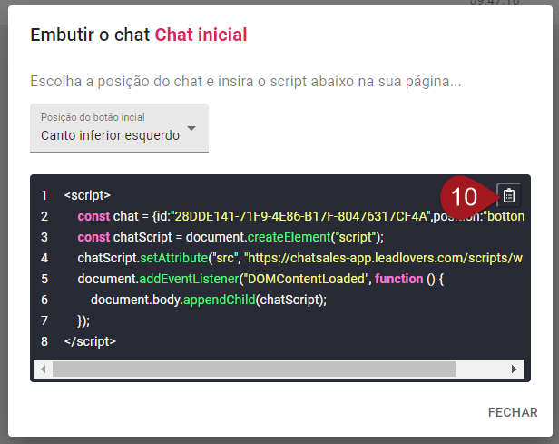 Nº10– Abrirá um pop-up onde você poderá Copiar o código do ChatBot.