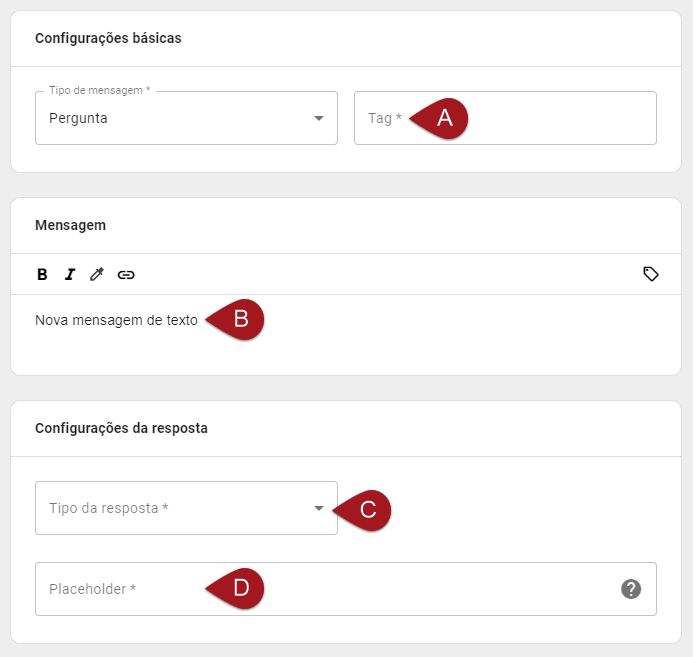 B) No campo de Mensagem escreva a pergunta que deseja fazer; Aqui você tem as mesmas opções de edição que tem no elemento Texto.