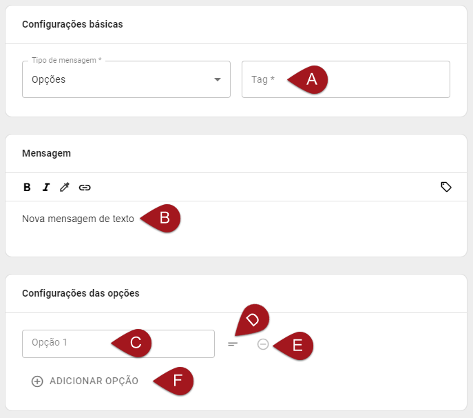 B) Configure a Mensagem de escolha. Novamente, as edições no Texto podem ser feitas como mostradas anteriormente.