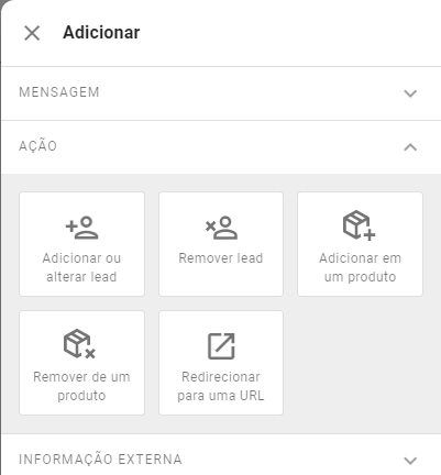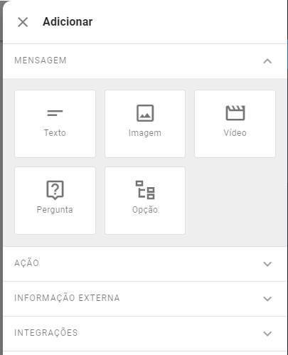 Clicando neste botão, você pode optar por adicionar uma nova Mensagem, uma nova Ação ou uma Integração.