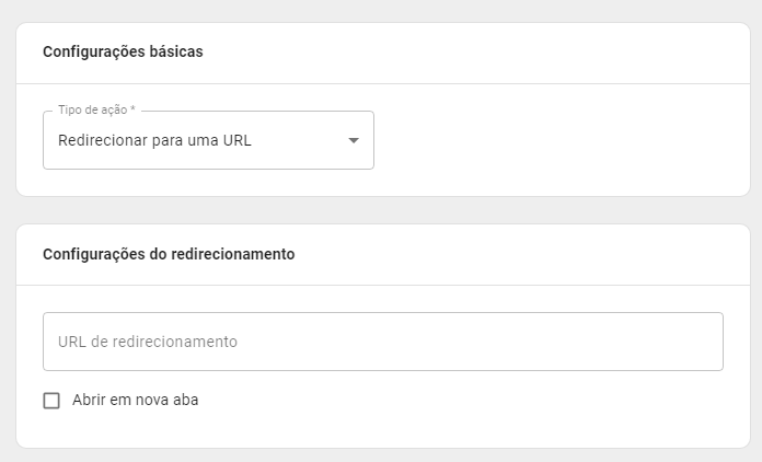 A) Assim que acessar essa área, basta adicionar a URL de redirecionamento, no segundo campo. Você ainda terá a opção de solicitar que seja “aberto em uma nova aba”.