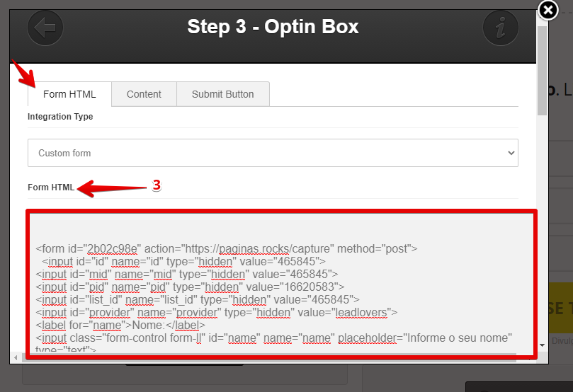 3 – Neste popup, na aba “Form HTML“, insira o código do formulário criado na leadlovers (o segundo código).