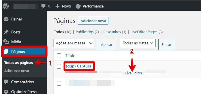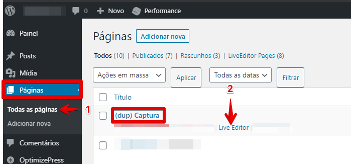 1 – Após logar no WordPress, Acesse aba páginas > todas as páginas.