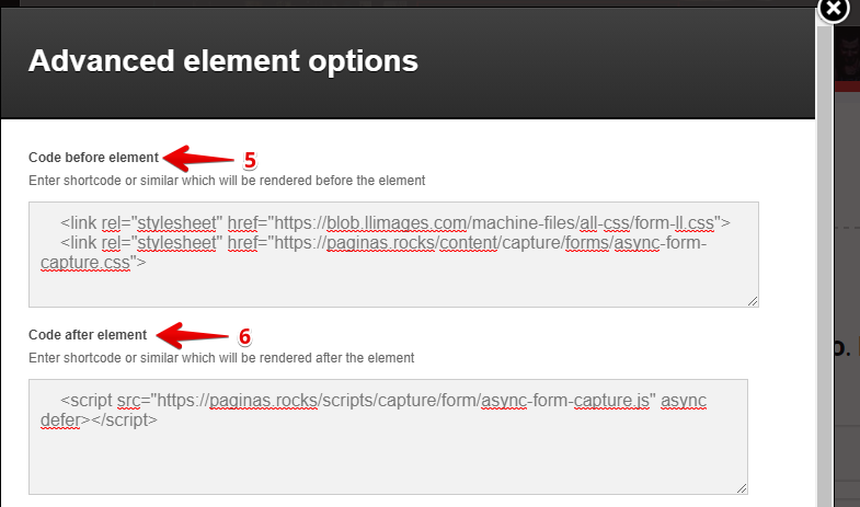 5 – Aparecerá outro popup de configurações. No campo Code before Element, insira o primeiro código do formulário, chamado de “Arquivo CSS“.