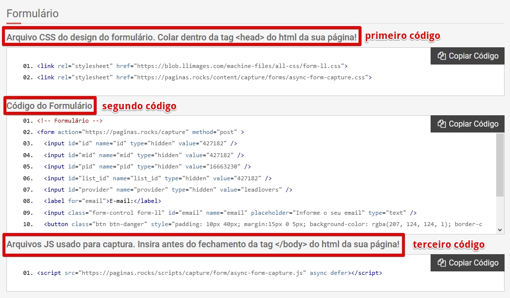Os formulários (Estático Padrão e Dinâmico) possuem três códigos: CSS – código do formulário – JS . Conforme ilustração abaixo, respectivamente, são esses: primeiro, segundo e terceiro código. Códigos esses que devem ser inseridos cada um em seu devido campo dentro de sua página criada através do WordPress.