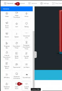 N 4º – Abrirá um leque de opções clique em um elemento chamado Custom HTML, em seguida, você arrasta esse elemento para a sua página, no local que você deseja incluir o formulário.