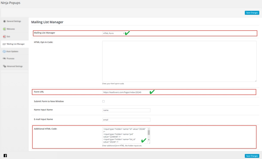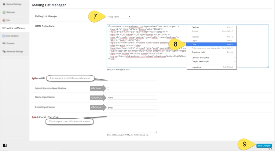 Nº 7 Selecione a opção HTML Form Nº 8 Em HTML Opt-in Code, cole o código do formulário leadlovers Nº 9 Clique em Save Changes para concluir Obs²: Após salvar, os campos Form URL e Additional HTML Code serão automaticamente preenchidos e o campo HTML Opt-in Code ficará em branco.